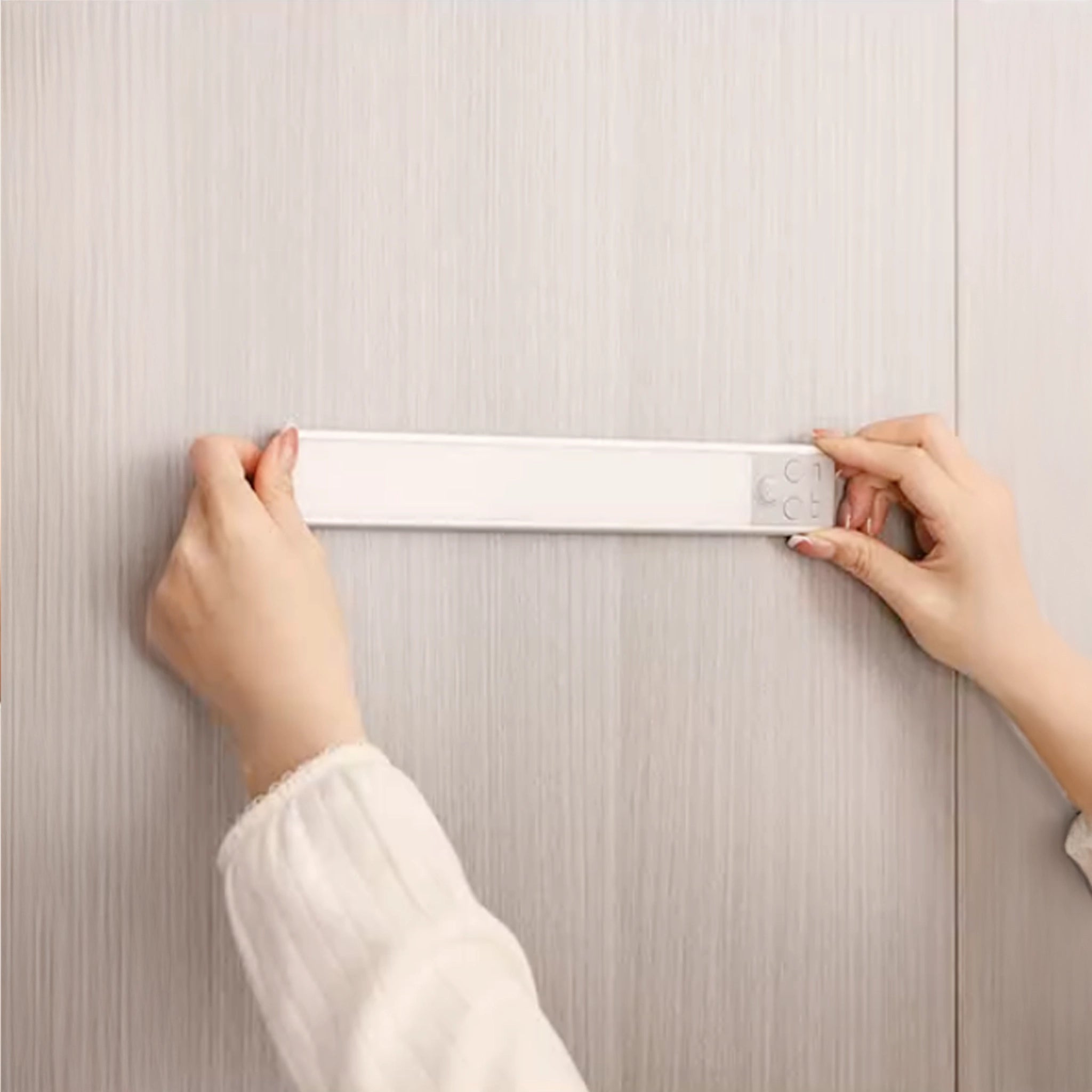 Aimantez la barre LED sur le support, sélectionnez la teinte et activez le mode détecteur. Vérifiez l’allumage au passage ; rechargez en USB-C si nécessaire.